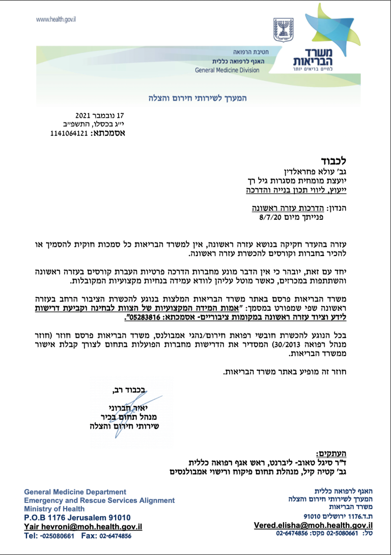 קיום קורסים לעזרה ראשונה : 44 שעות מורחב , 22 שעות , 8 /6/4 שעות